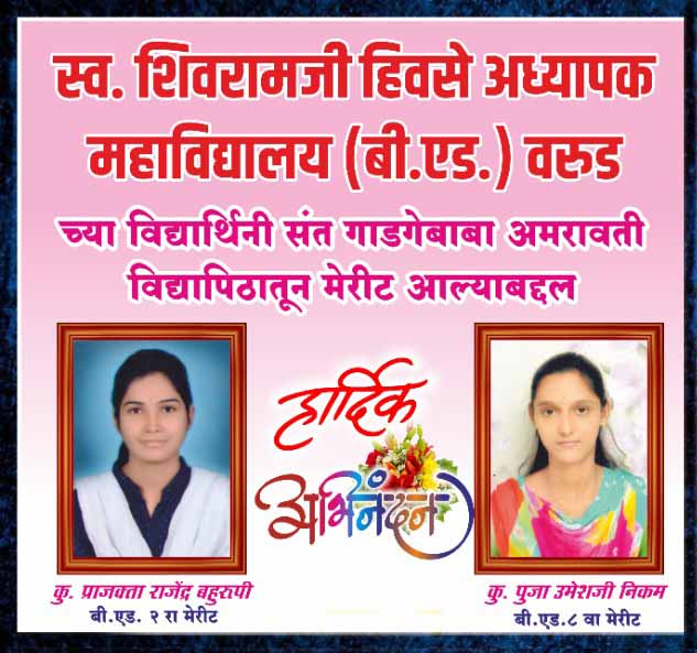 The Maharashtra Gramin Vikas Welfare Society, Amravati Reg. No. 1299 Late Shivramji Hiwase B.Ed. College, Warud Behind New English School , Near Bus Stand, Warud Dist Amravati |